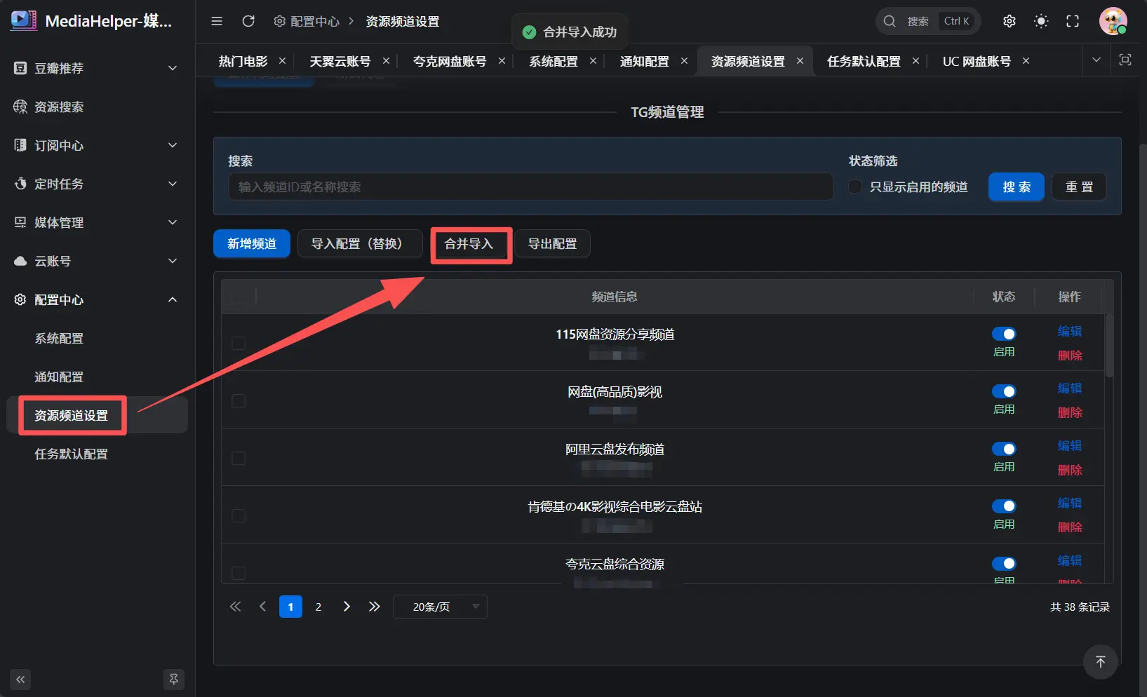 仍在 配置中心 → 资源频道设置 页面,点击 合并导入,选择我们准备好的资源频道文件进行导入。
