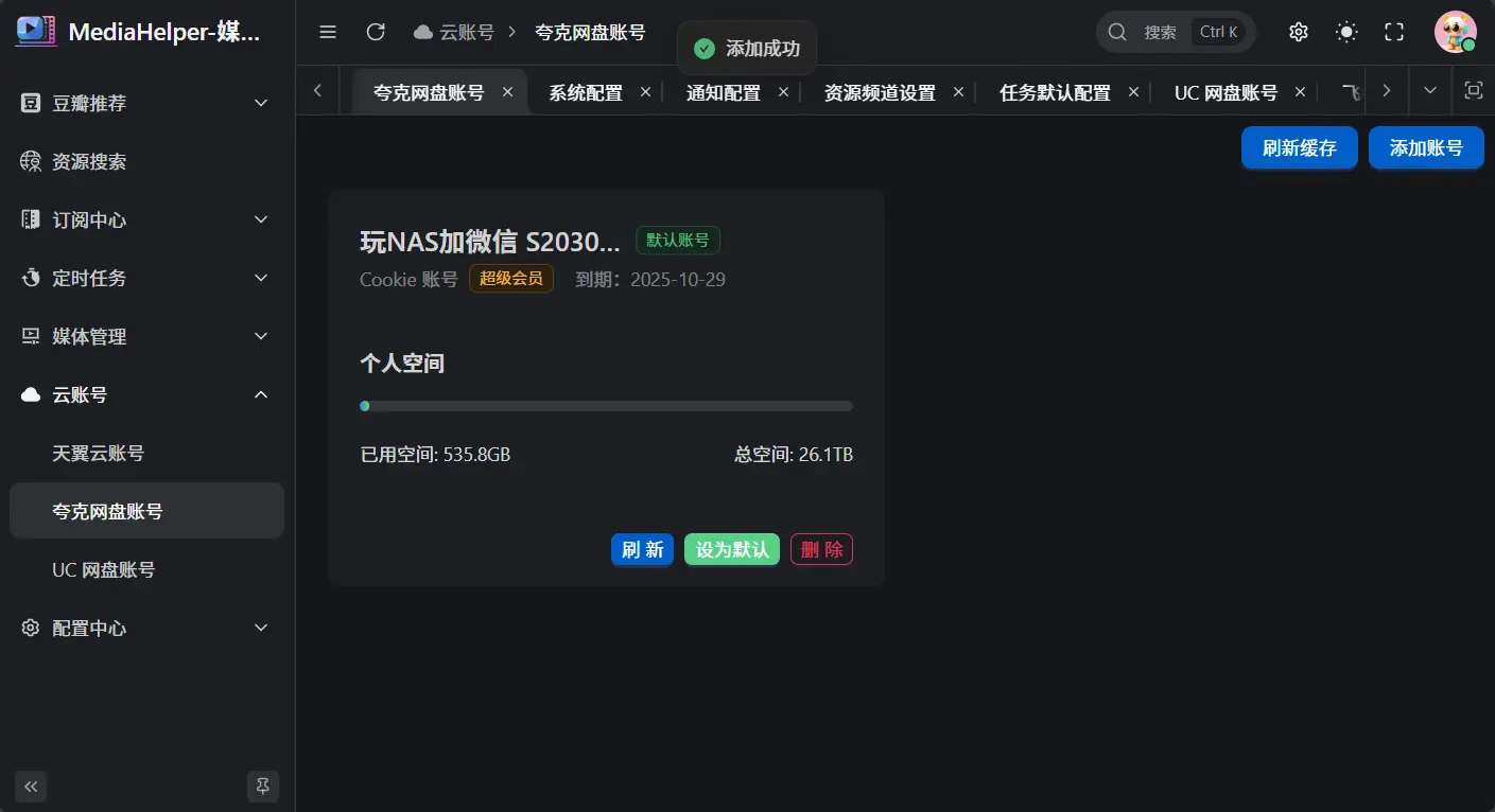 提示“添加成功”后,即可正常使用该云盘账号。