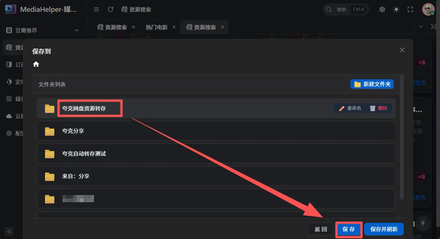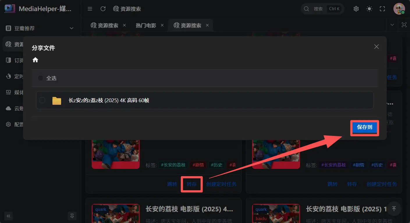 选中一个想要保存的资源,点击 转存 → 保存到;