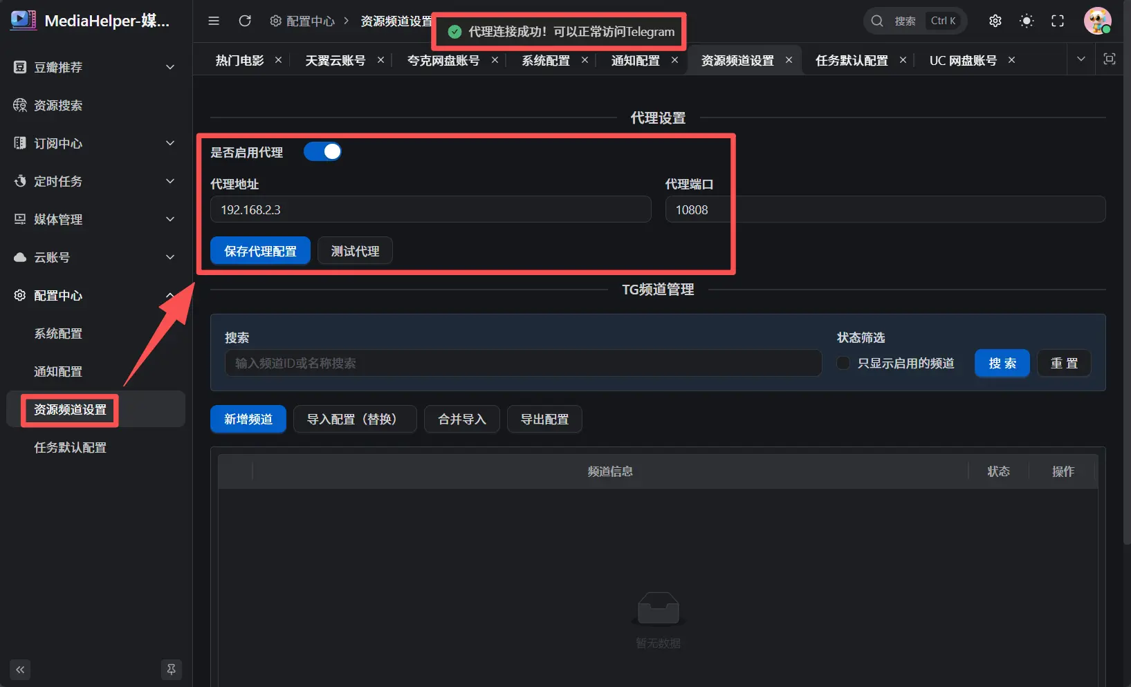 进入 配置中心 → 资源频道设置,勾选 启用代理,然后填写你的代理信息。