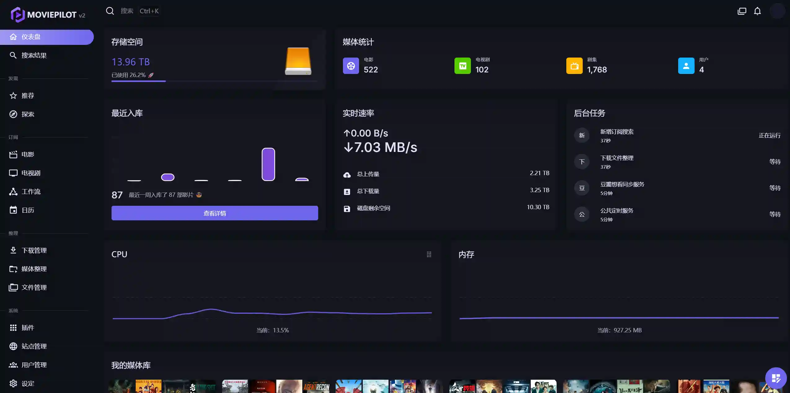 MoviePilot-v2 以“自动化”为核心,重构并强化了多项功能,形成从资源发现到播放的闭环管理,关键功能如下:
